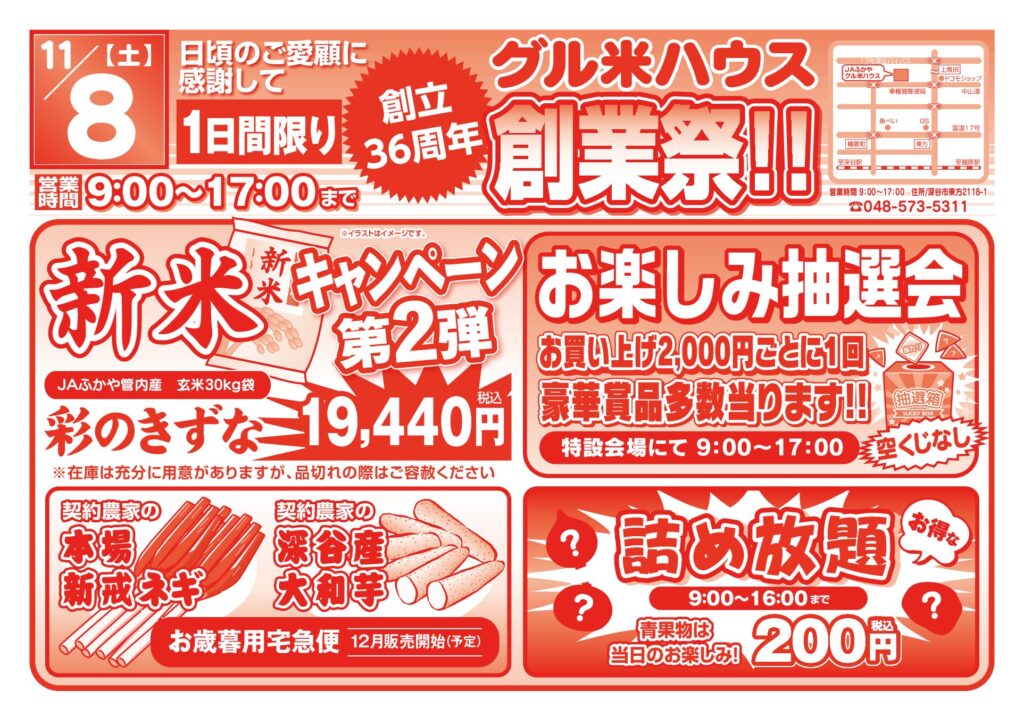 | 11月上旬 | 創業祭 日頃の感謝をこめて、農産物大特価販売!! |